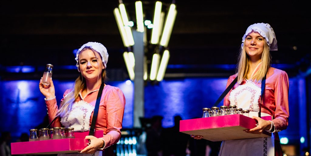 Im Rahmen des Deutschen Kongresses für Orthopädie und Unfallchirurgie richteten die Hoflieferanten Berlin das festliche Präsidenten-Dinner in den Bolle Festsälen aus. Die 300 Gäste wurden stilgerecht mit einem Buttermilch-Shot aus der Bügelflasche und köstlichem Fingerfood, untermalt von Leierkastenmusik, empfangen. Als Vorspeise erwartete die Gäste Bienenstich vom Brandenburger Ziegenkäse mit Brunnenkresse und geräuchertem Tomaten-Estragonsugo. Nach den zahlreichen Ehrungen ging es weiter mit Ceviche vom Saibling mit Stangensellerie, Erdnüssen und Ziegenkäse sowie als vegetarische Alternative: Ceviche vom Hokaido mit Erdnüssen und Ziegenkäse. Als Hauptgang reichten wir im Glochen-Service Rinderfilet und Rinderbäckchen mit Portweinschalotten, Buttermöhren und Kartoffelstampf mit der vegetarischen Alternative: Törtchen von Kichererbse und Spinat, Lauch und Sellerie.